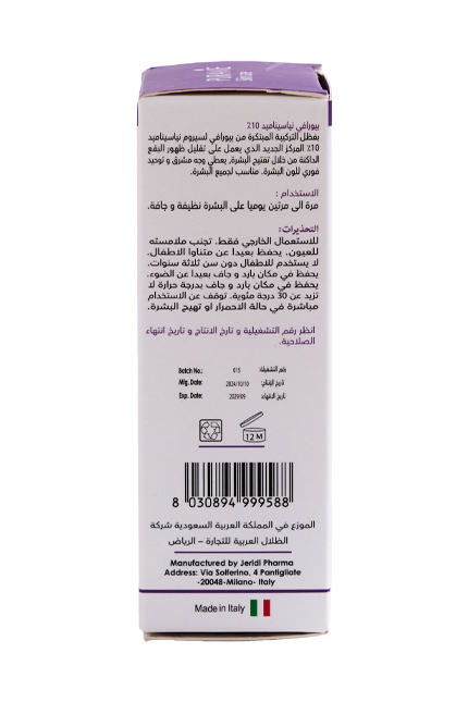 يحتوي على تركيز فعال من 10% نياسيناميد، مدعوم بـ حمض الهيالورونيك (Sodium Hyaluronate) والبانثينول لتحسين ملمس البشرة وتعزيز ترطيبها الطبيعي.